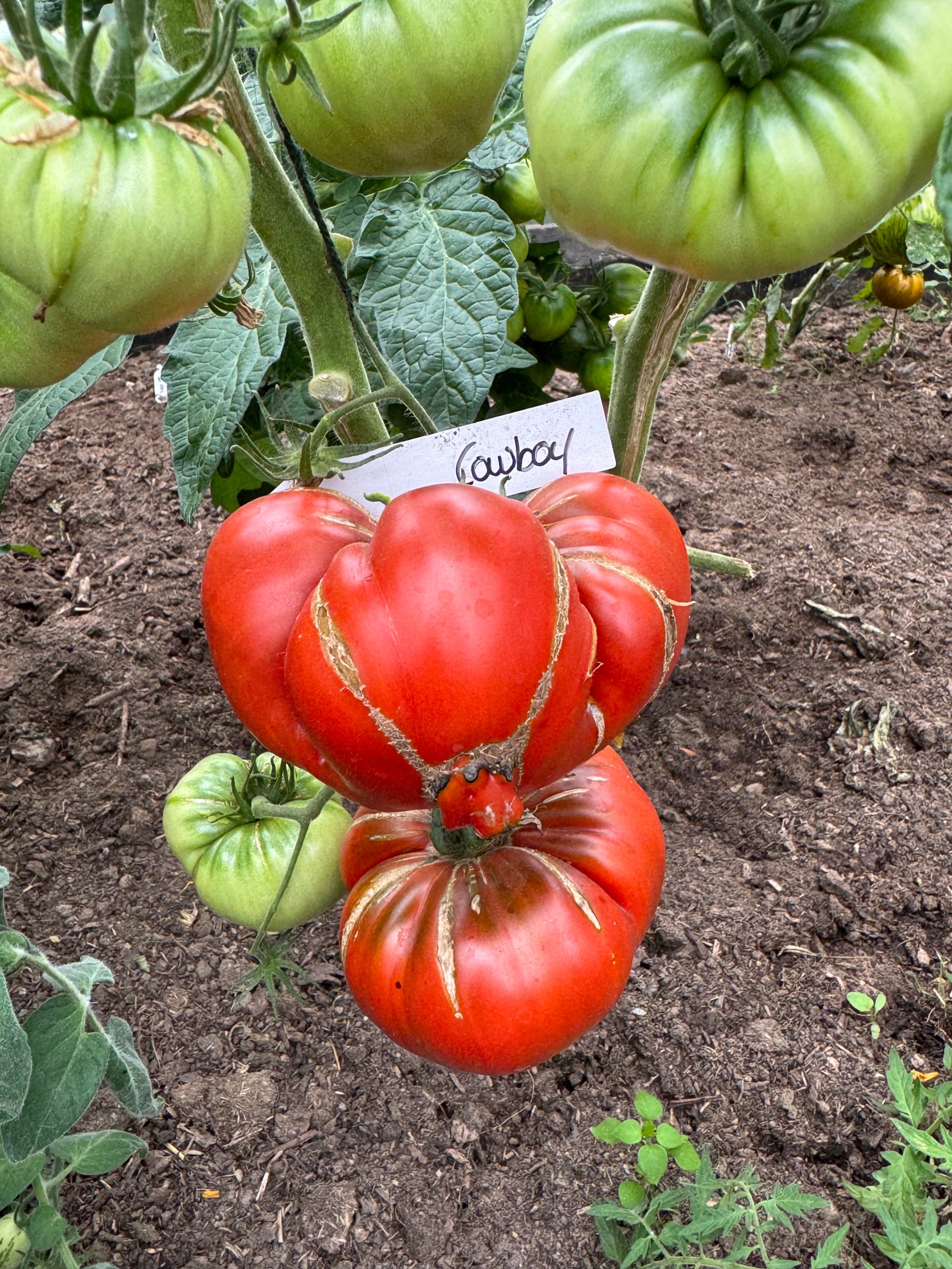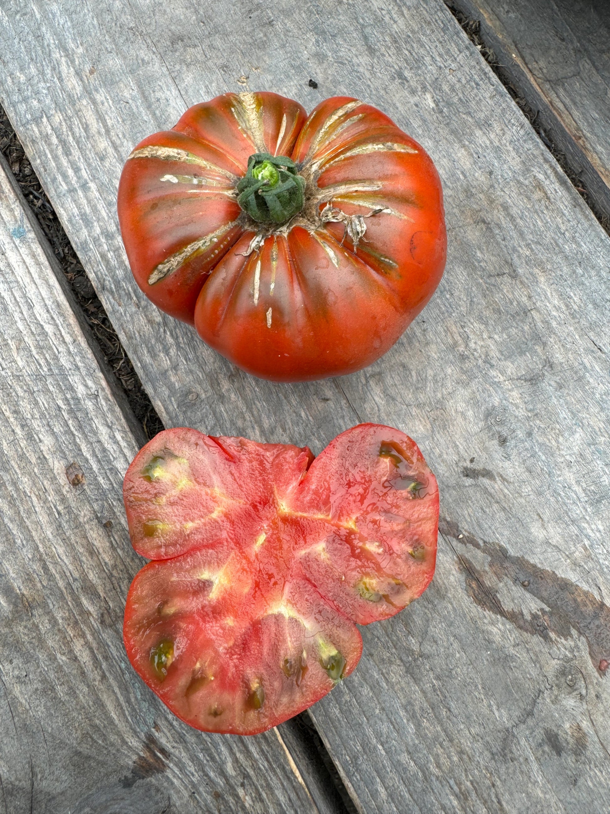A large mahogny colored beefsteak tomato Meaty inside with a deep rich tomato flavour. Another gorgeous tomato from Canadian karen Olivier. 80 days