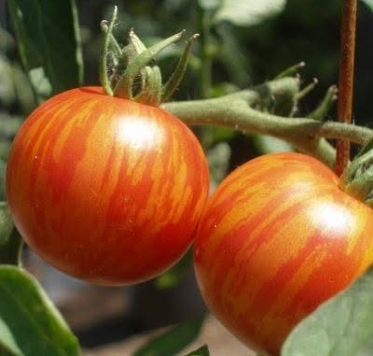 Orange-red Tomatoes streaked with green that turns gold when ripe. Small round fruit of 60 to 80 grams.