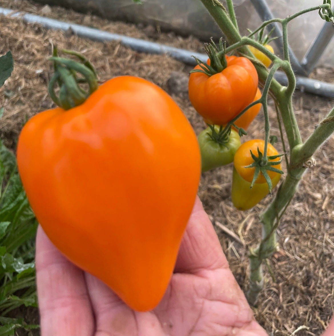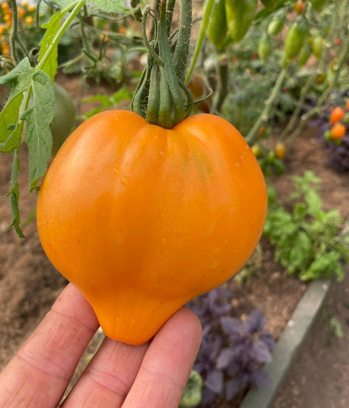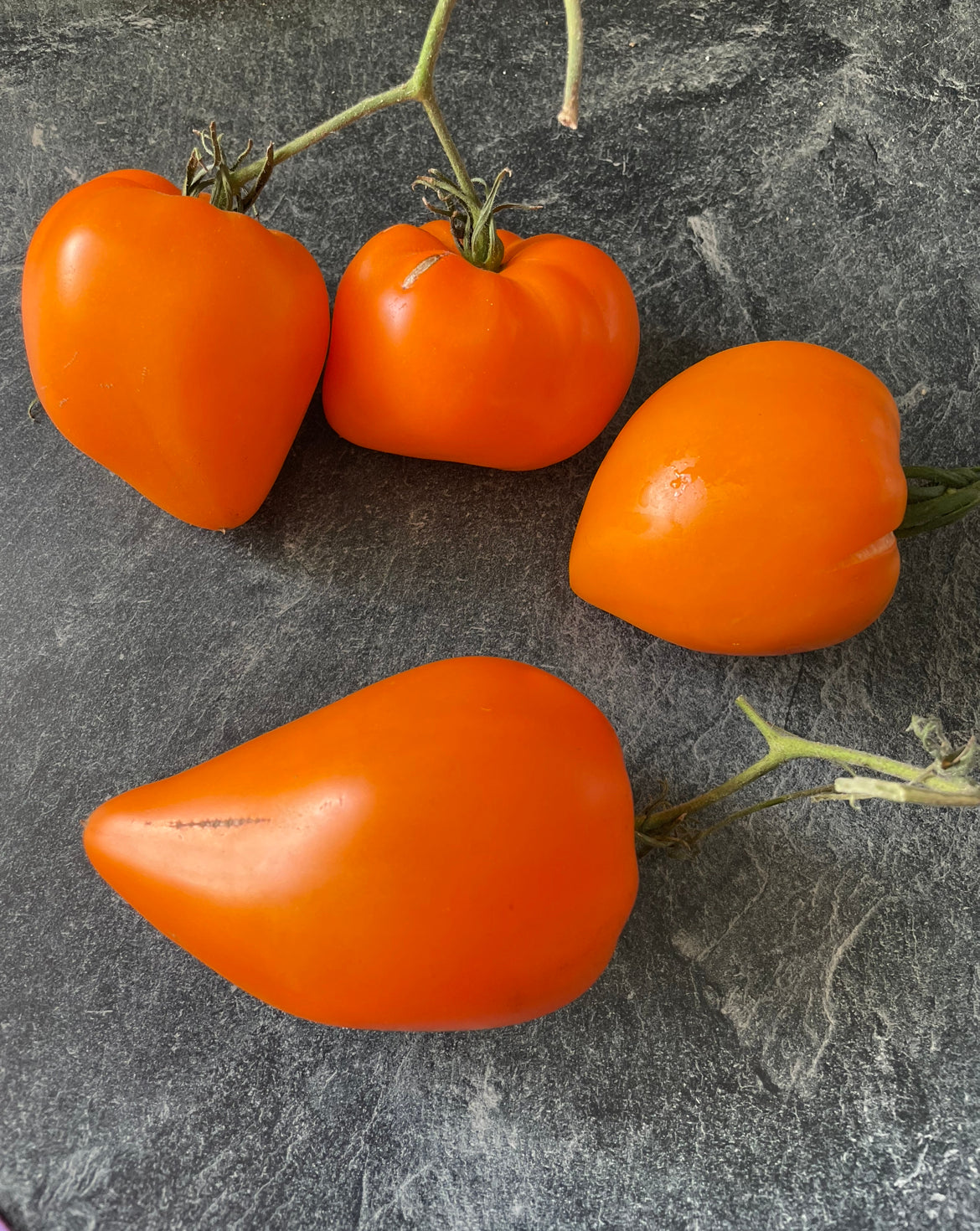 When I first bought seeds for this variety, i have to admit that it was almost purely due to the cute name… But it did not disapoint. Russian large heart-shaped orange fruit with a tip reminiscent of a fox nose. Dense and fleshy beefy flesh with little gel and seeds. Sweet flavour with a hint of acidity.
