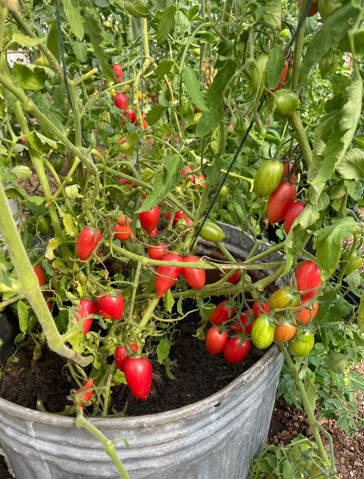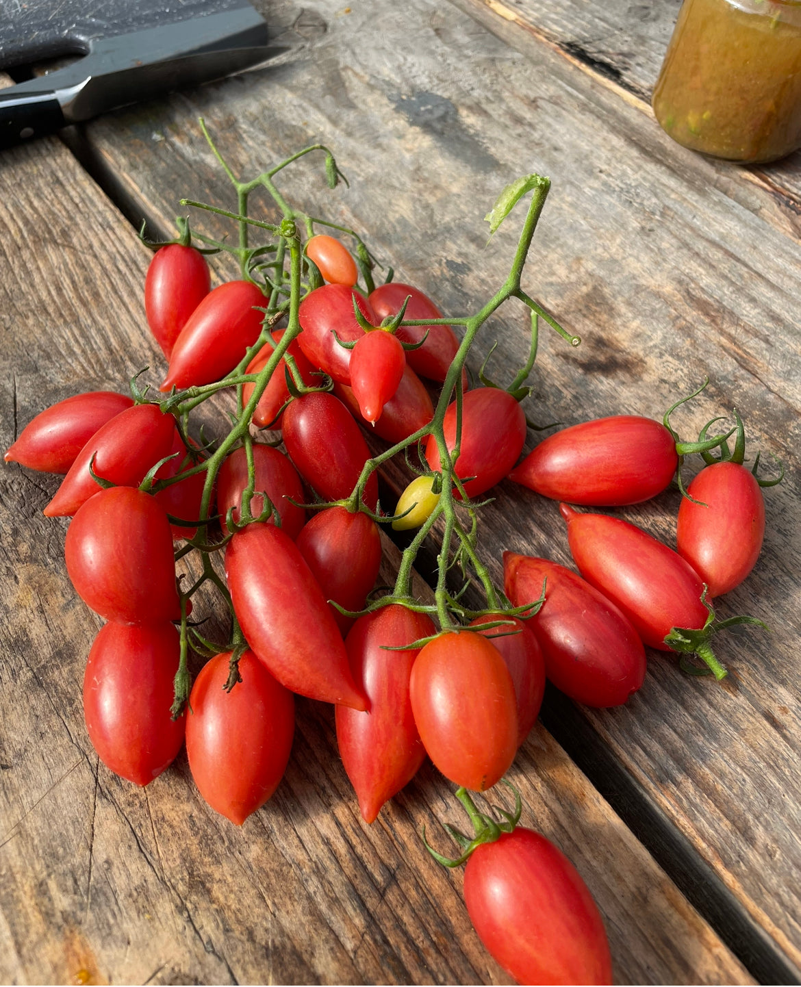 This amazing bush variety is in my top ten list! It a tumbling plant growing with long, cascading stems. You can grow it in an big container or an big hanging basket. No pruning. Raspberry red plumshaped tomatoes with yellowisg marbeling or stripes. Sweety fresh and abseloutely delicious as a snack tomato. Early, heavy producer.