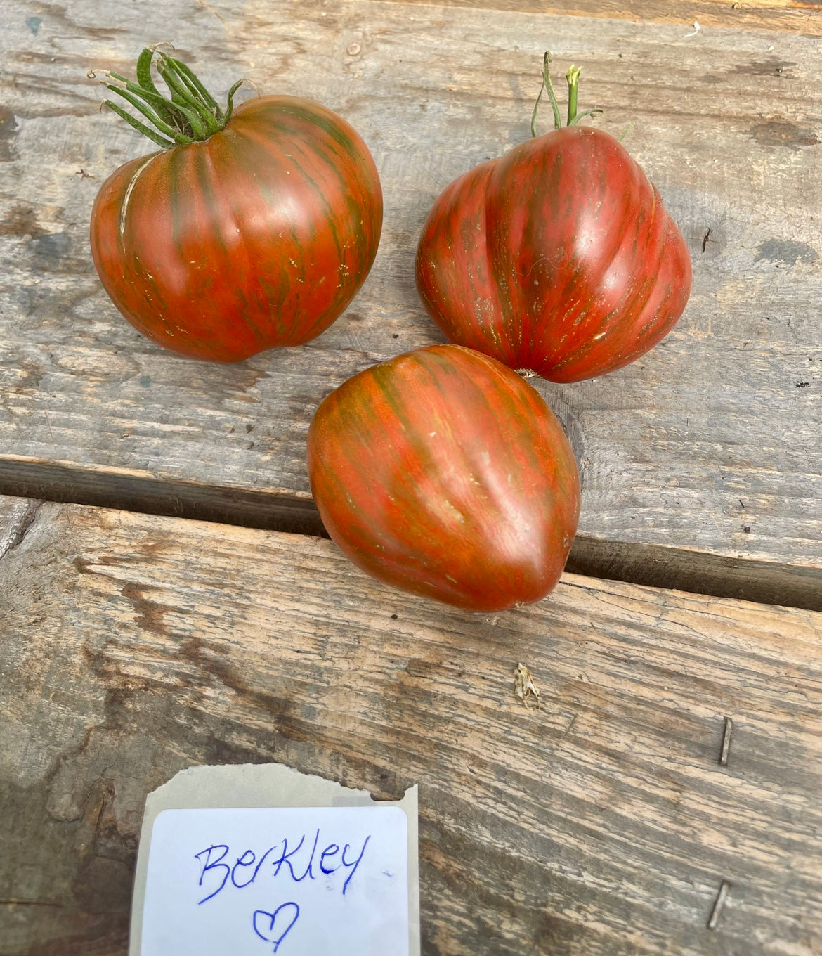 Oxheart beefsteak tomato from Brad Gates and Wild Boar farms. Looks and tasted a lot like the classic berkley tie dye. Dark red with green stripes. Dark burgundy / brown interior. The tomatoes are meaty, very tasty, sweet, and attractive. Reportedly, this variety sets fruit well even during a bit cold summer weather.
