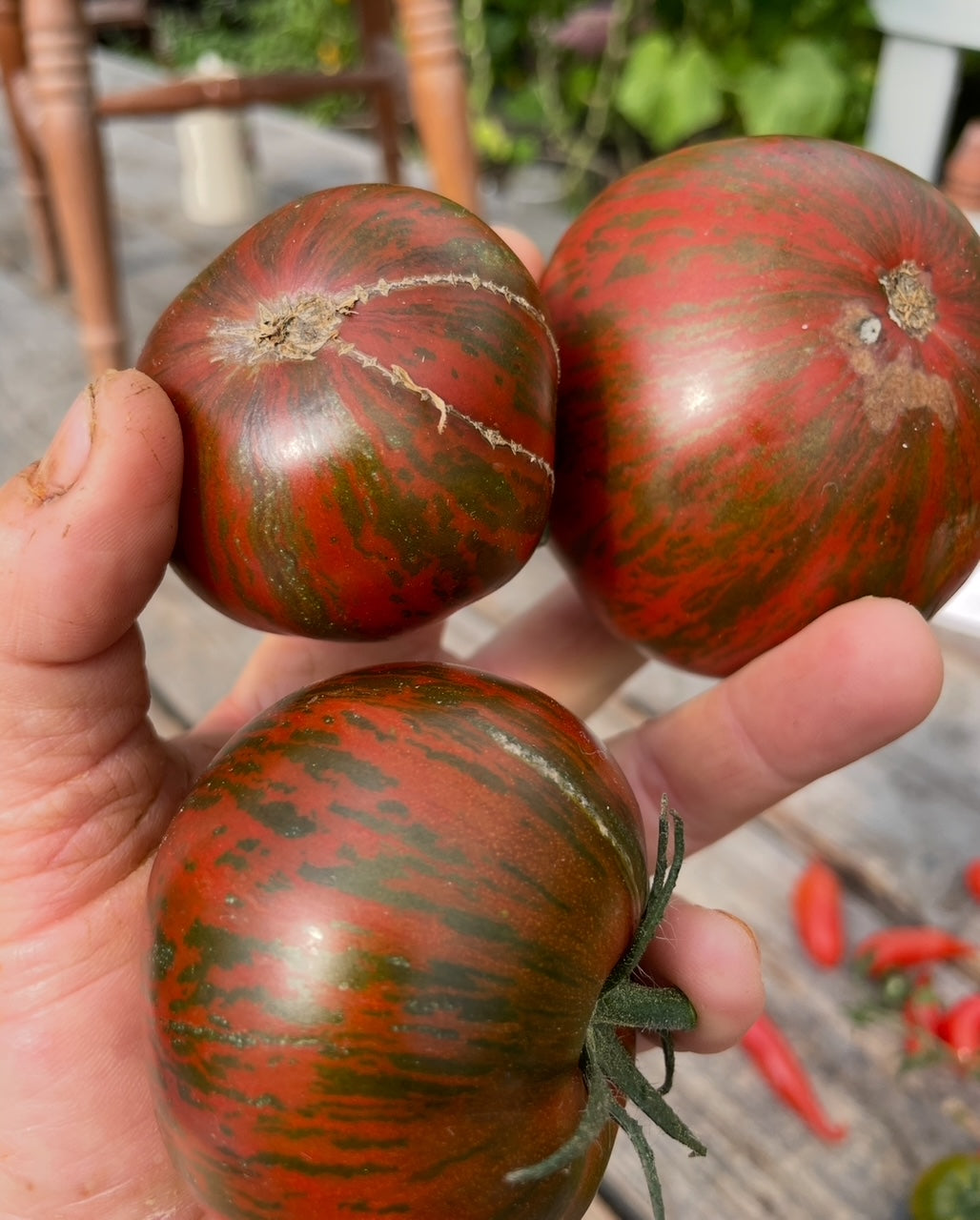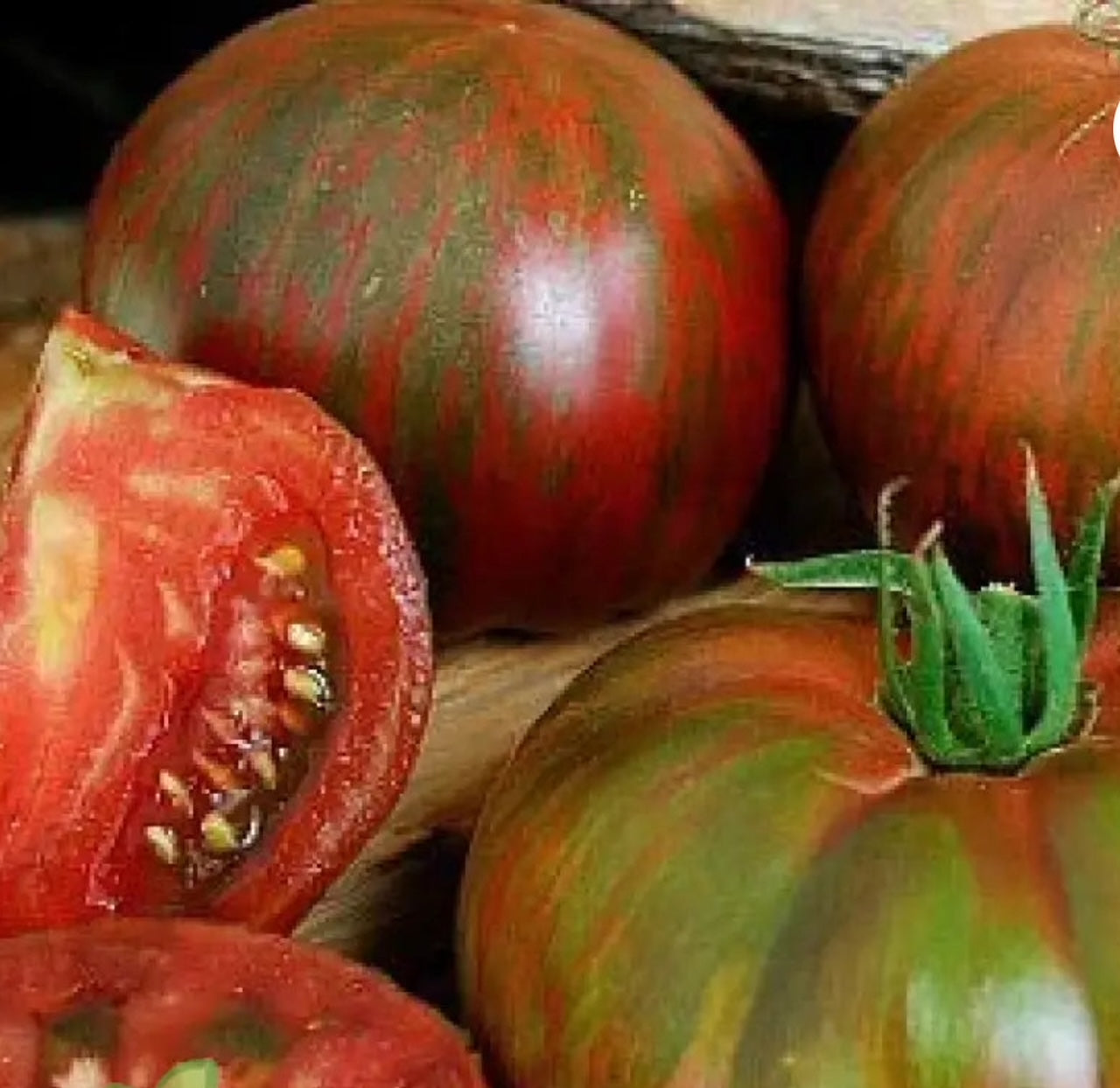 Beautiful interdeterminant beefsteak variety with red and green zebra stripes. Tomatoes are from 100 – 300 grams approximately Fleshy and juicy beef meat. Excellent rich tomato flavor like the other Tie dye varieties. ( Pink, heart, green)