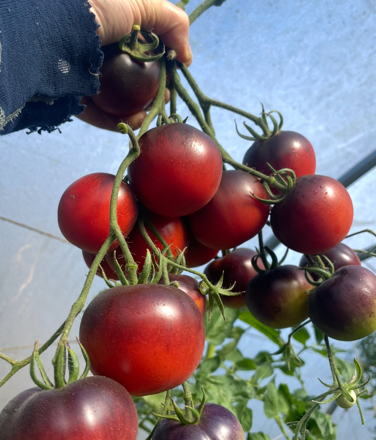 The tomatoes are pink-red base with dark blue/purple shoulders, weight ~70-300 g.