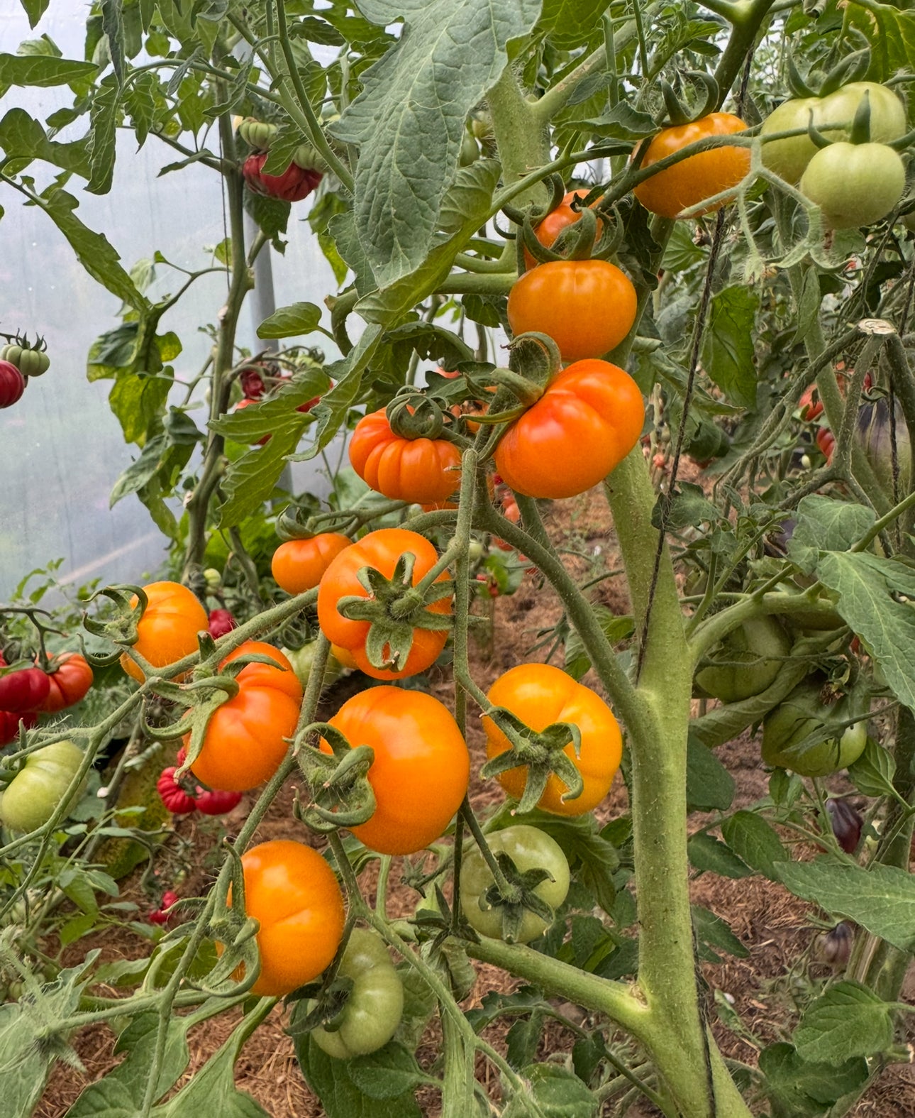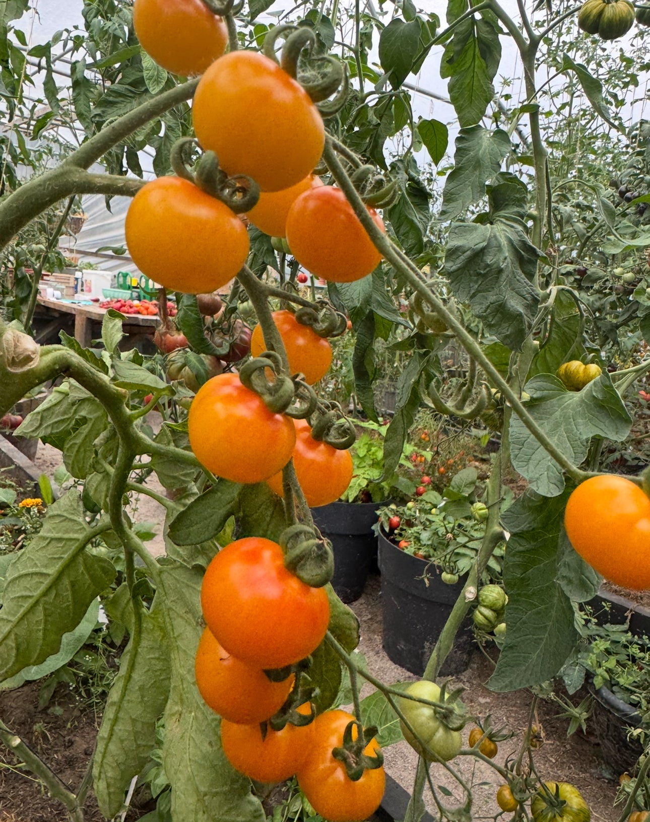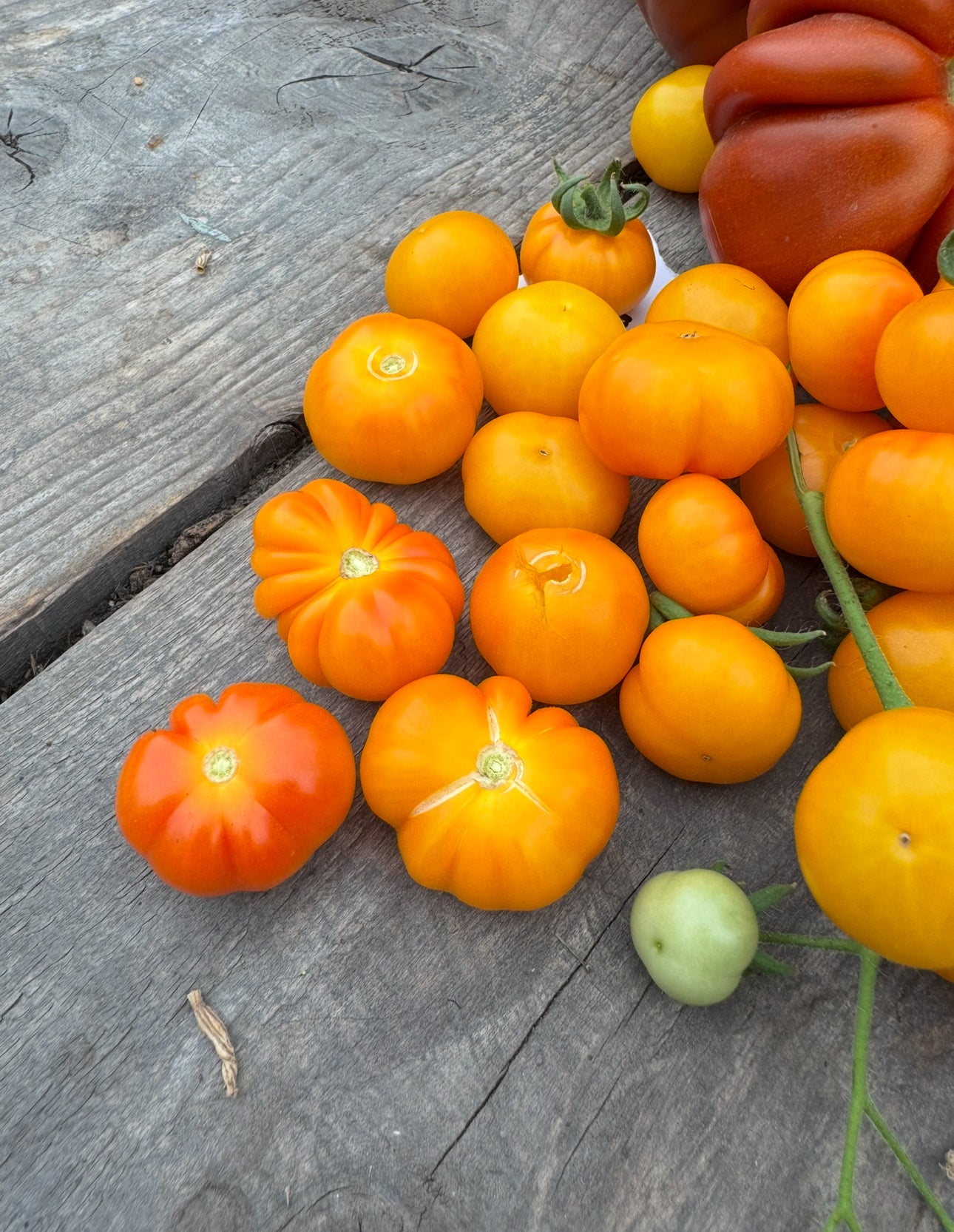 Serbian heirloom tomato producing clusters of small tomedium golden-yellow fruits. The fruits looks like mini beef tomatoes. they are slightly flattened and ribbed, with a