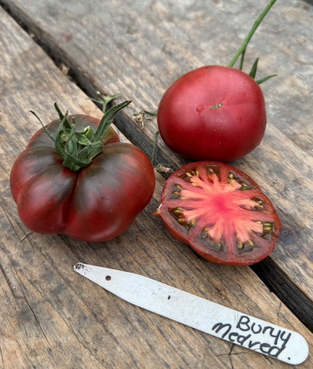 Buryy Medved, also called “Brown Bear” is a smaller to medium -sized beefsteak tomato. Russian origin.