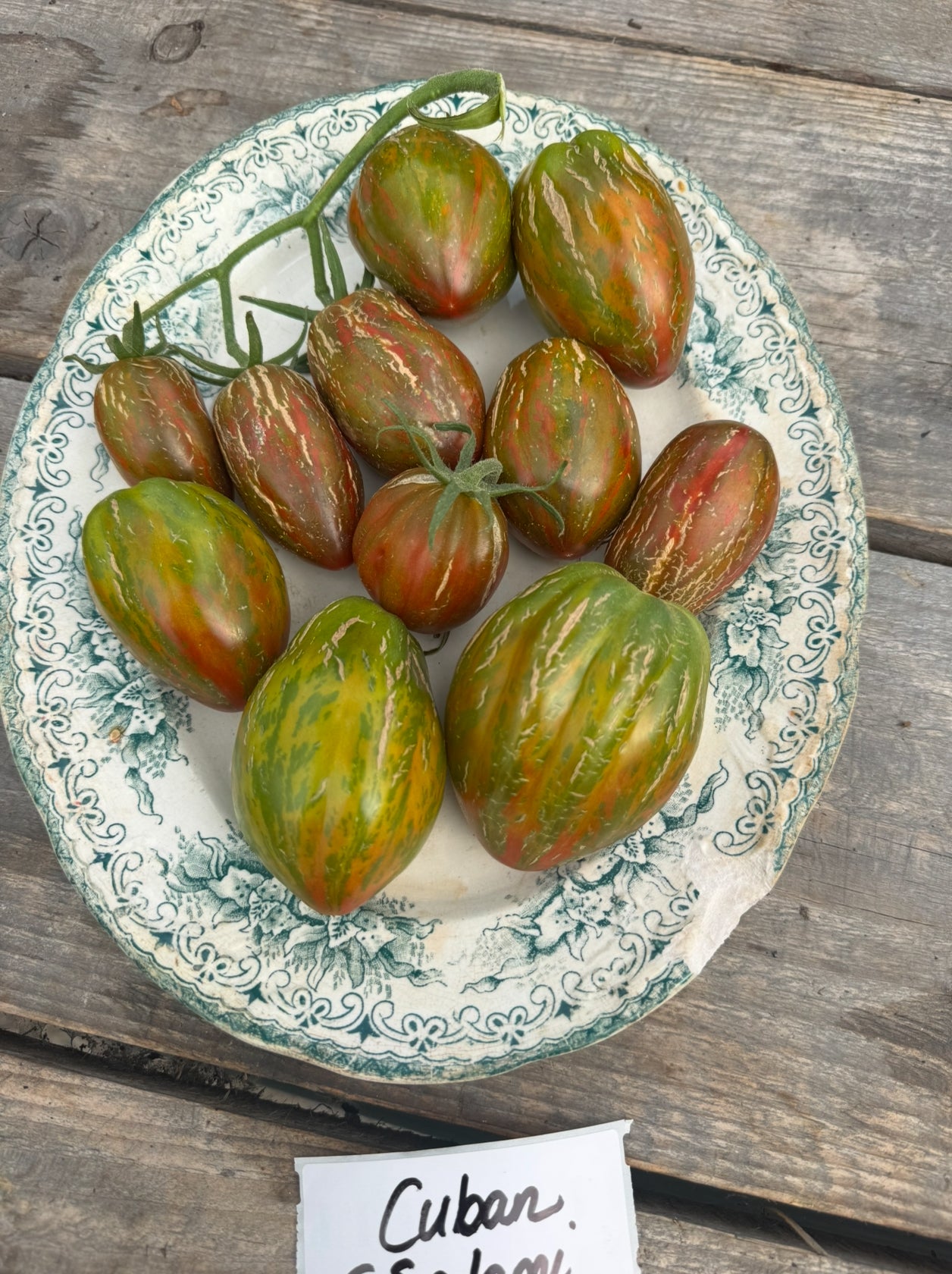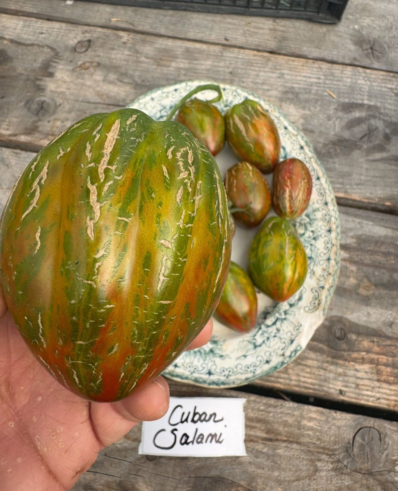 The tomatoes have an unusual heart-to-pear shape, weighing 100–150 grams, fleshy, nearly seedless, with dense yet juicy flesh. At full maturity, the skin is green-olive with purple streaks and stripes, sometimes with black shoulders.