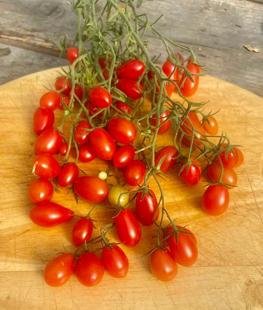 Another favorit! Early red pear or tear shaped cherry tomatos. The plant produces massive bunches of red fruits. Extra sweet, flavorful and crisp snacking tomato.