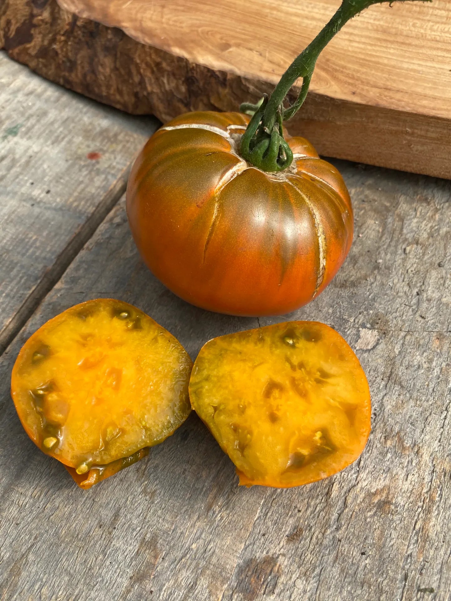 Beautiful copper brown / golden beefsteak-type tomato fruits weighing 150-300 g with bronze-orange skin and green shoulders.