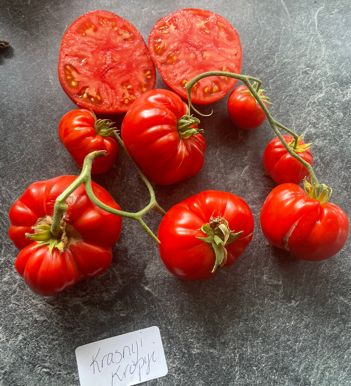 A medium sized shiny red beefsteak variety from Russia. Slightly ribbed. Has a pleasant rich tomato flavour! Prolific, also in cold climates.