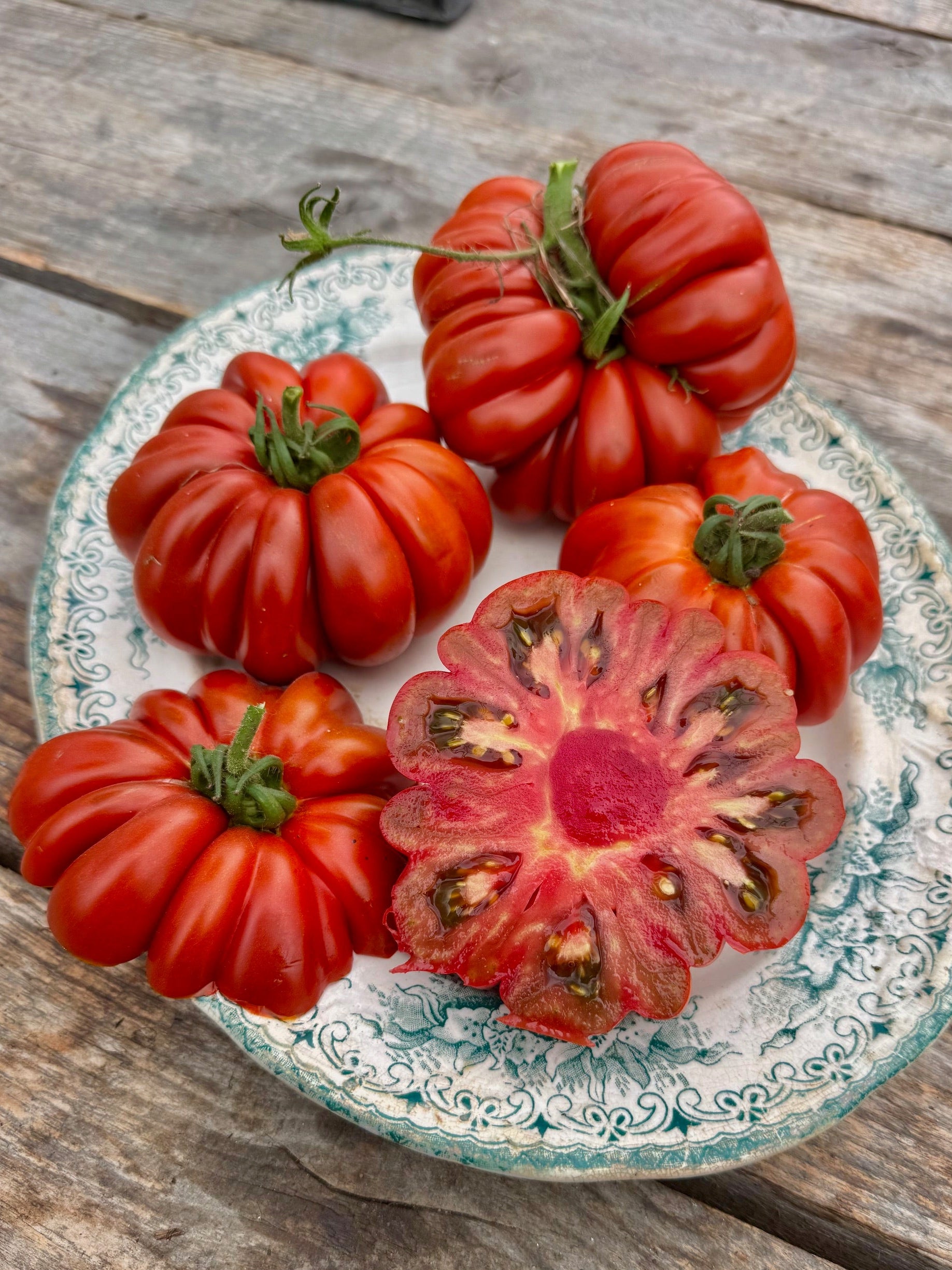 This is an abseloutely stunning tomato! Big, dark red, deeply ribbed tomatoes. Looks like a flower when cut through.