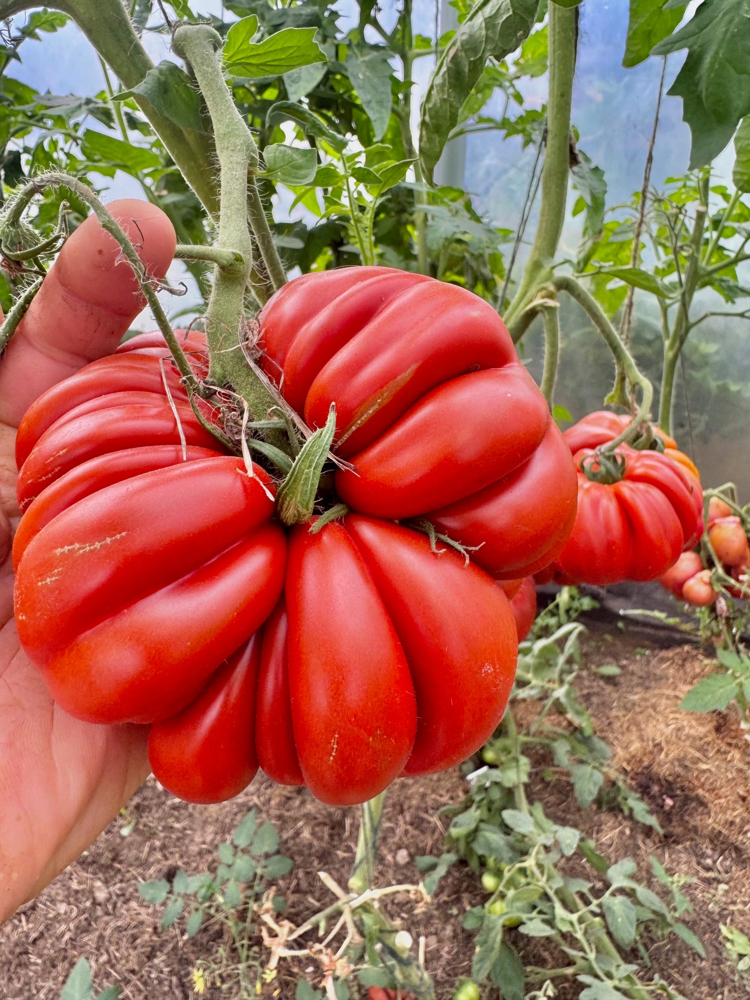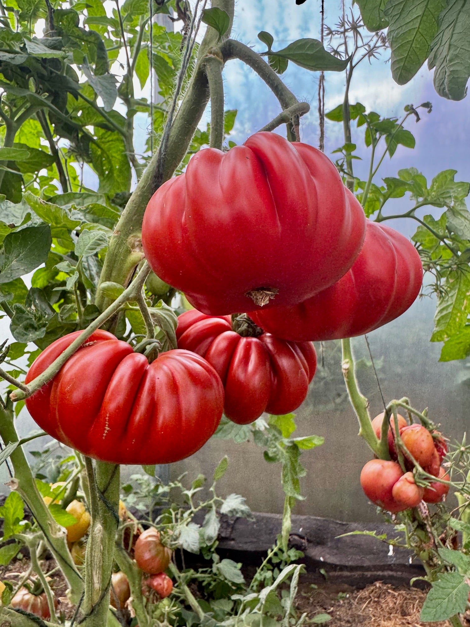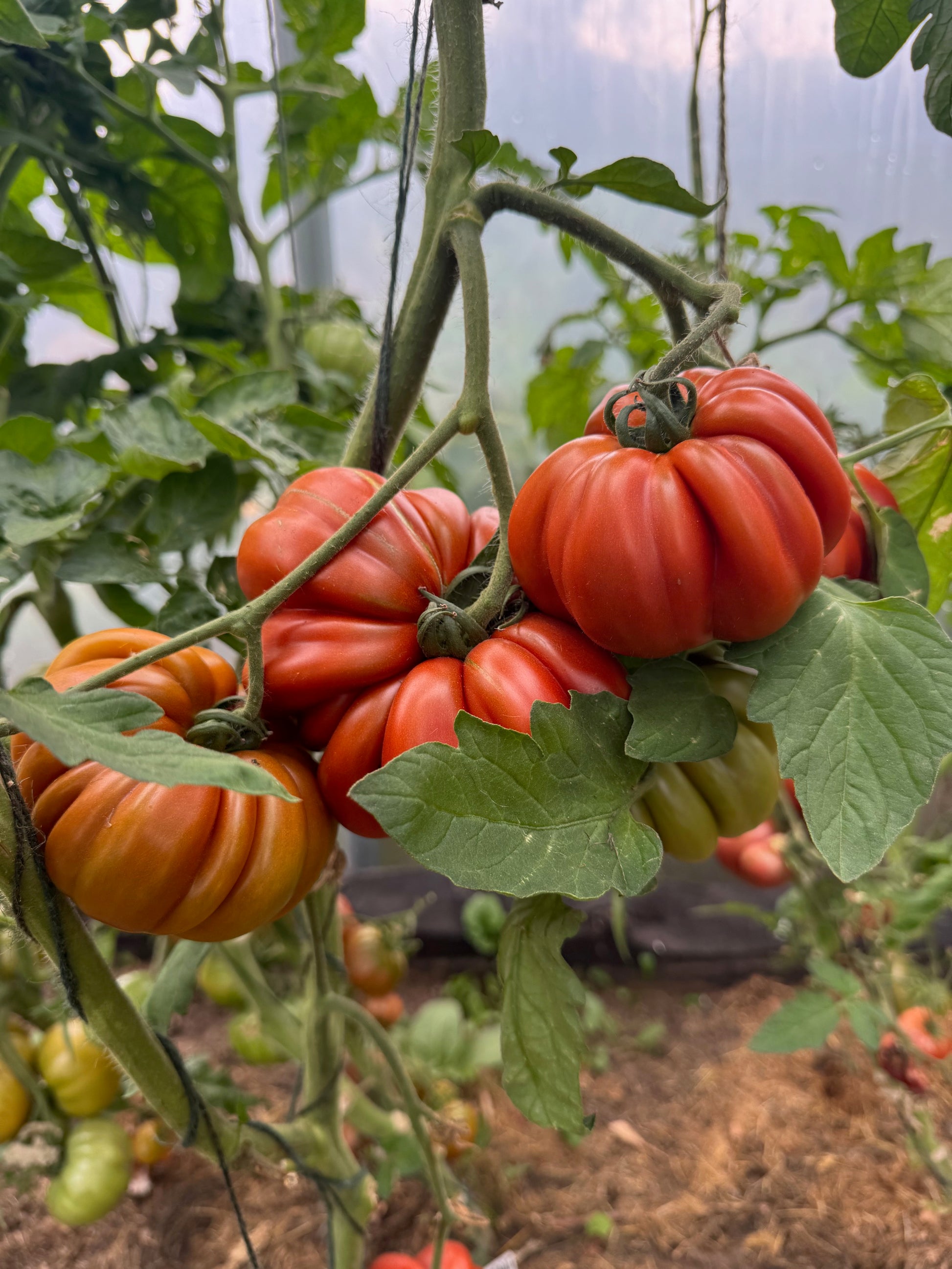 Fruits are grown on tall thick vines. The tomatoes are very rich, sweet and very meaty. great as a slicer, and also perfect for sauce and canning.