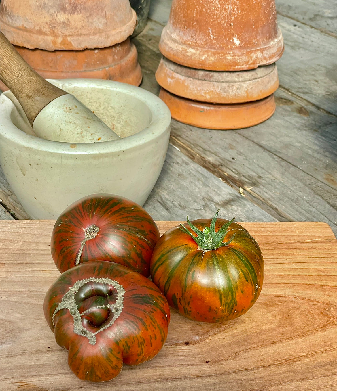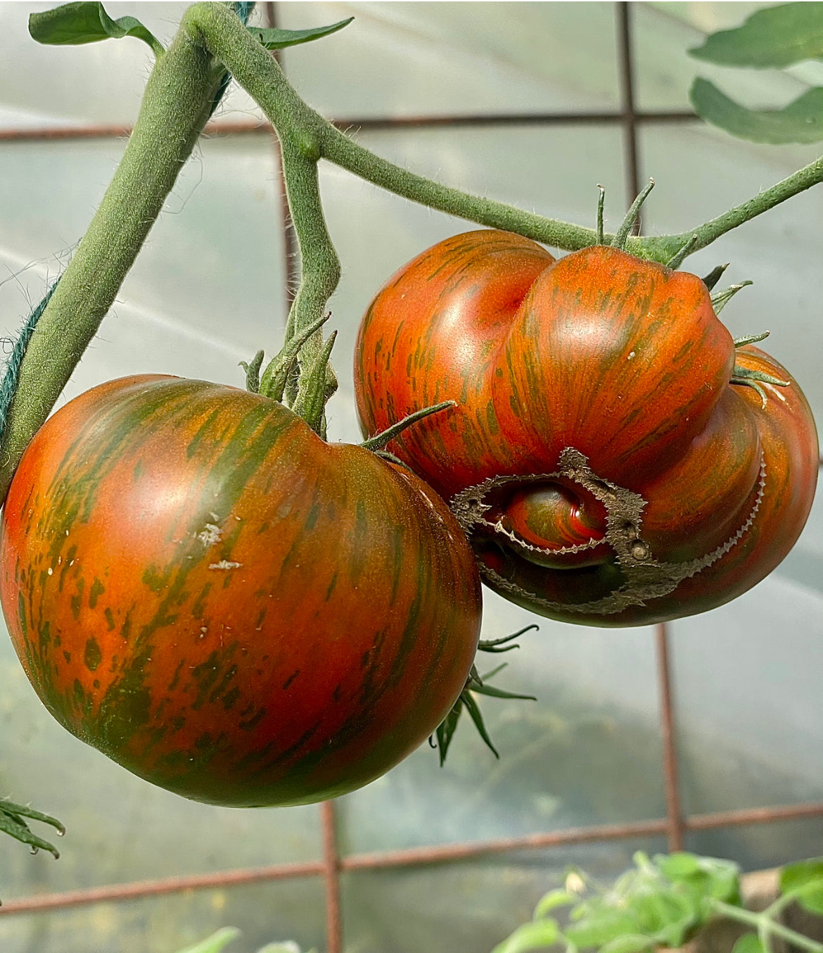 Not weird at all. Just a very beautiful beefsteak tomato. Brown with green stripes. Flavor is rich and sweet with good balance. This is a surprisingly good tomato! Perfect for sauces, sandwiches, and as a slicing tomato. High yield. Cordon variety.