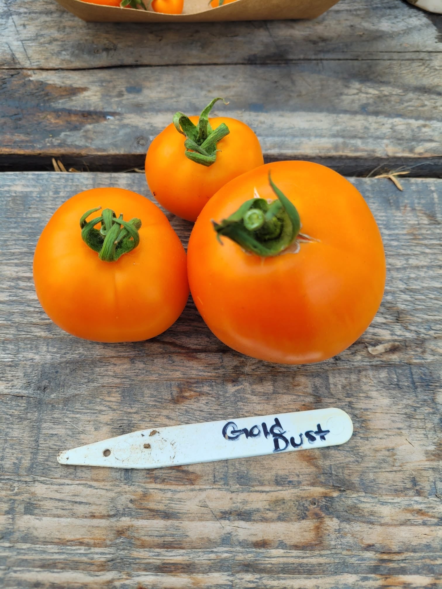 Gold Dust tomatoes are a determinate bush variety known for their sweet, juicy, golden-orange fruits, making them ideal for salads and fresh eating