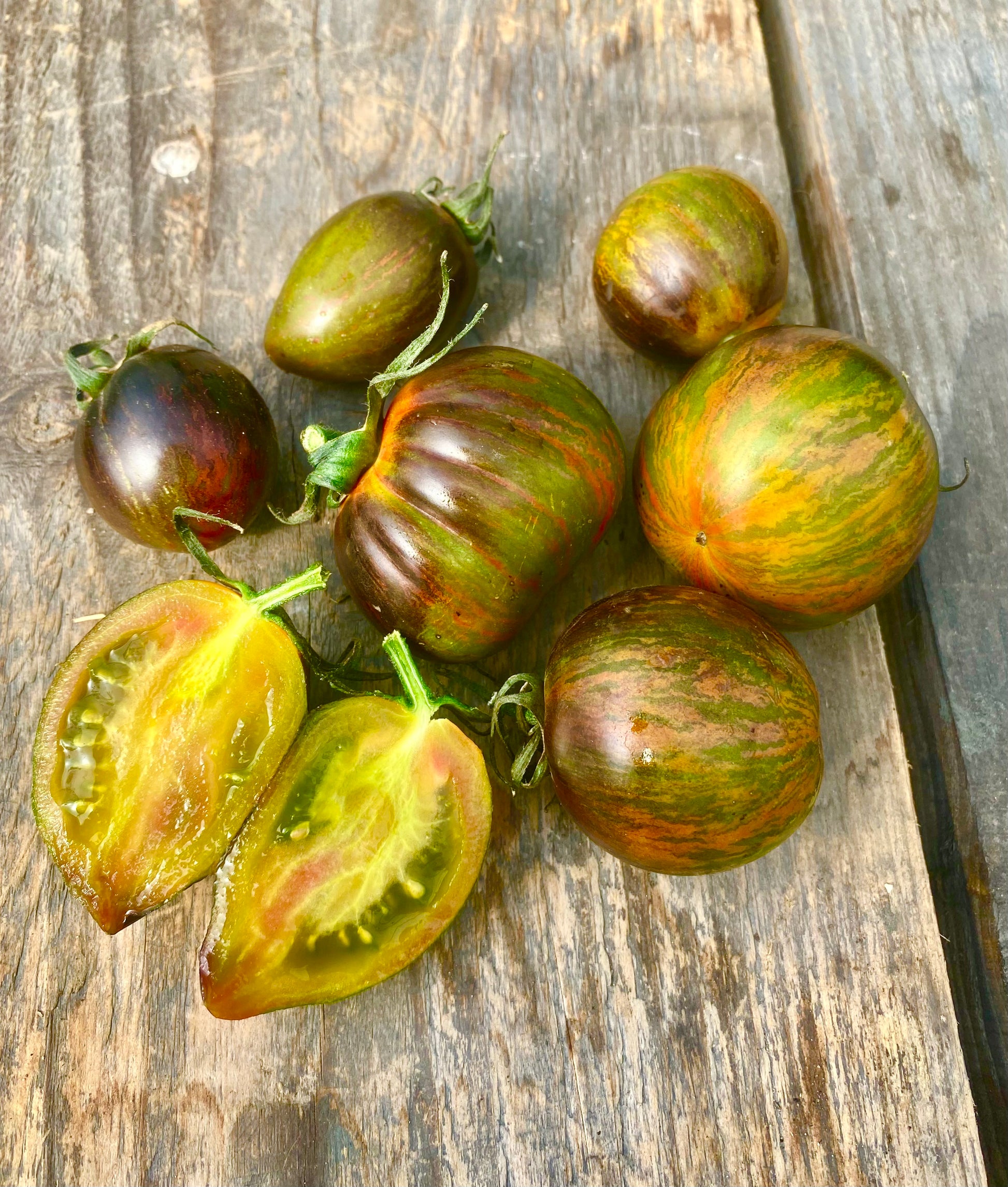 An incredibly beautiful tomato from Wildboar farms. The tomatoes are multicolored and striped in green, black, red and brown. Not a cherry tomato, but an improved version of the famous “Brad’s atomic Grape”. Amazingly sweet and juicy and wonderful taste! cordon, mid-season – ripens in about 75 days