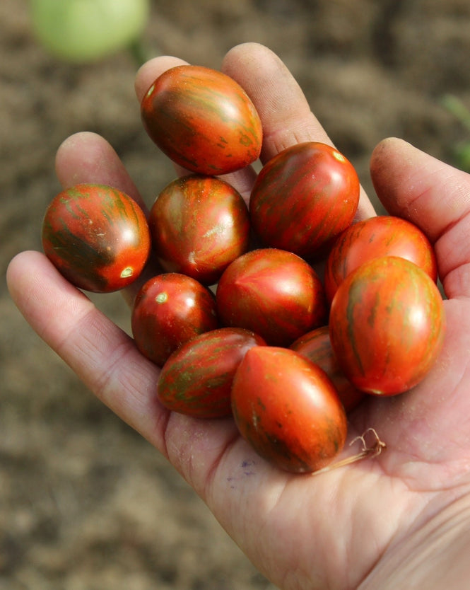 Ornamental small micro bush with red/brown elongated small cherry tomatos with red flesh inside.