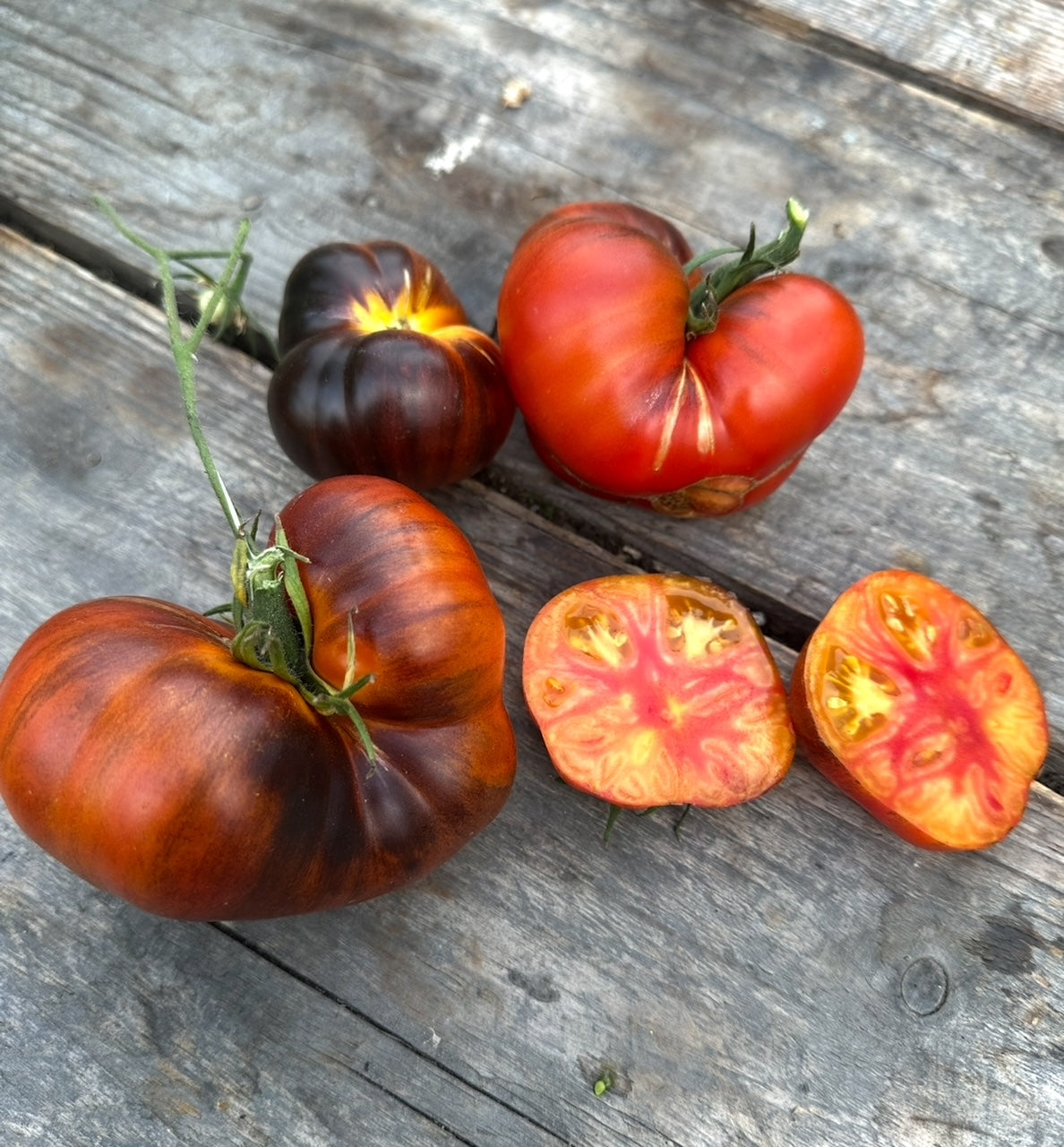 Beautiful tomato variety with Orange / red fruits from 150 to 350 grams, round beefsteak type, flattened with black shoulders.