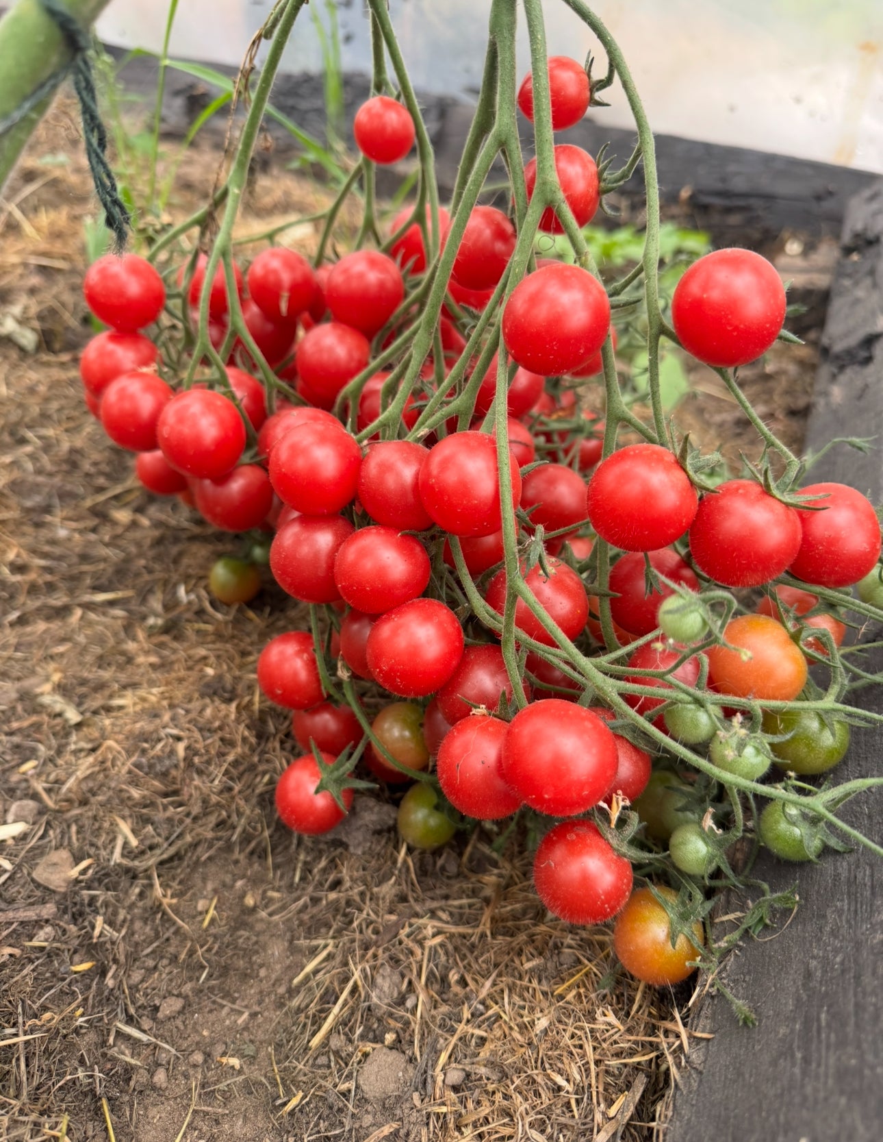 Raspberry red pink high-yielding cherry tomato producing huge clusters of oval fruits weighing 15–25 g .