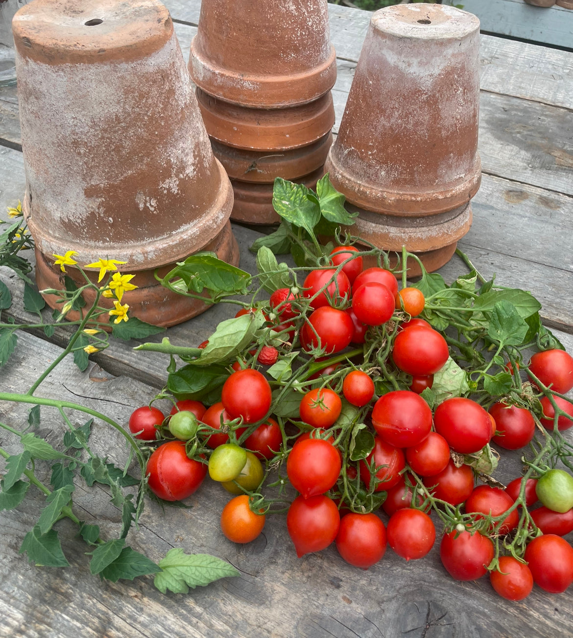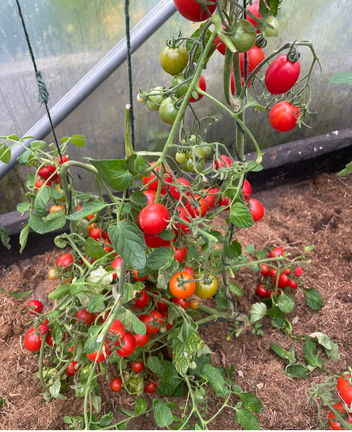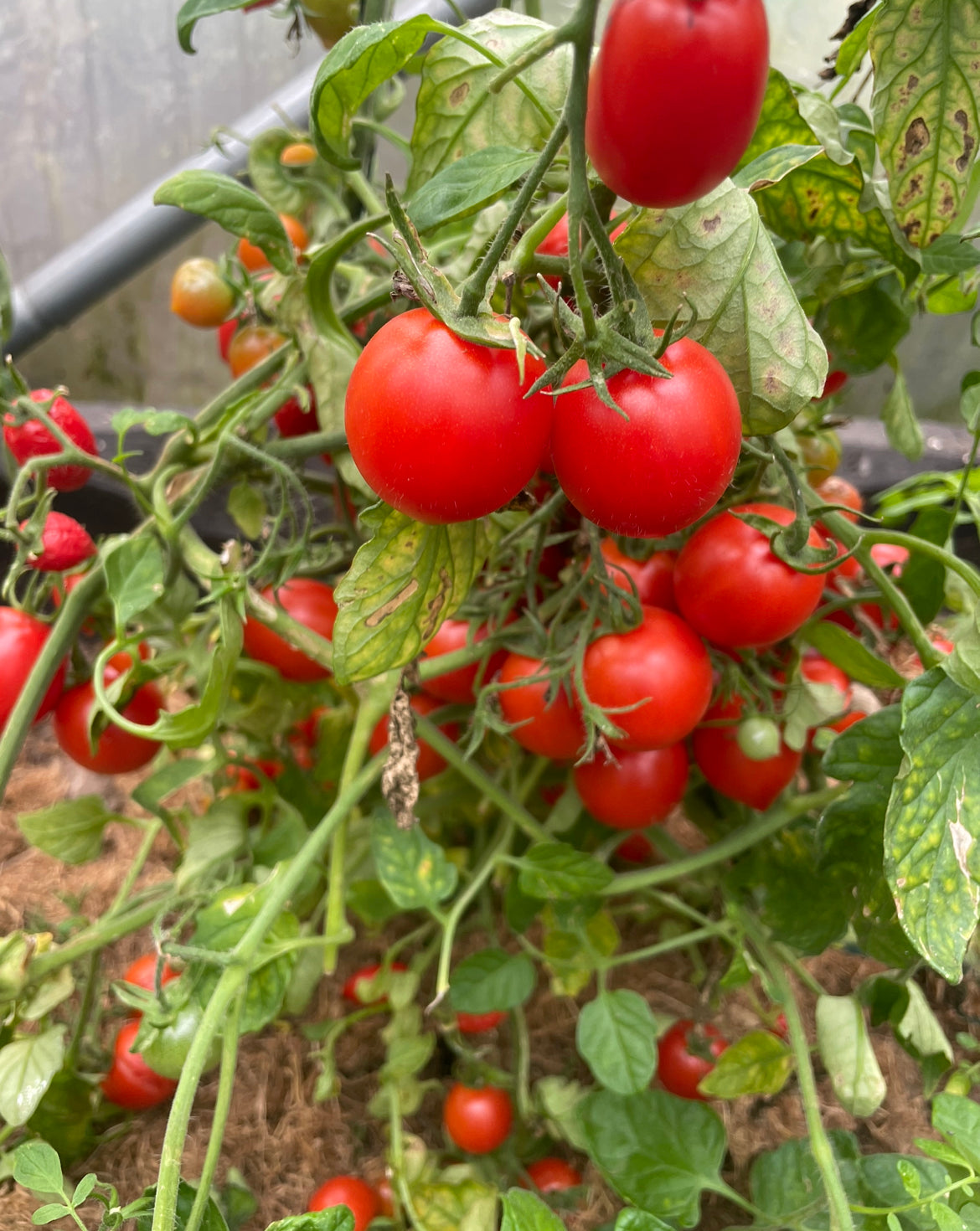 This tomato I grow because it is early and very prolific. Red round cherry-sized tomatoes. Doesn’t get taller than about a meter here at my place. Great for containers. Robust variety that can also be grown outside. juicy and sweet taste that is suitable for snacking and for salads.