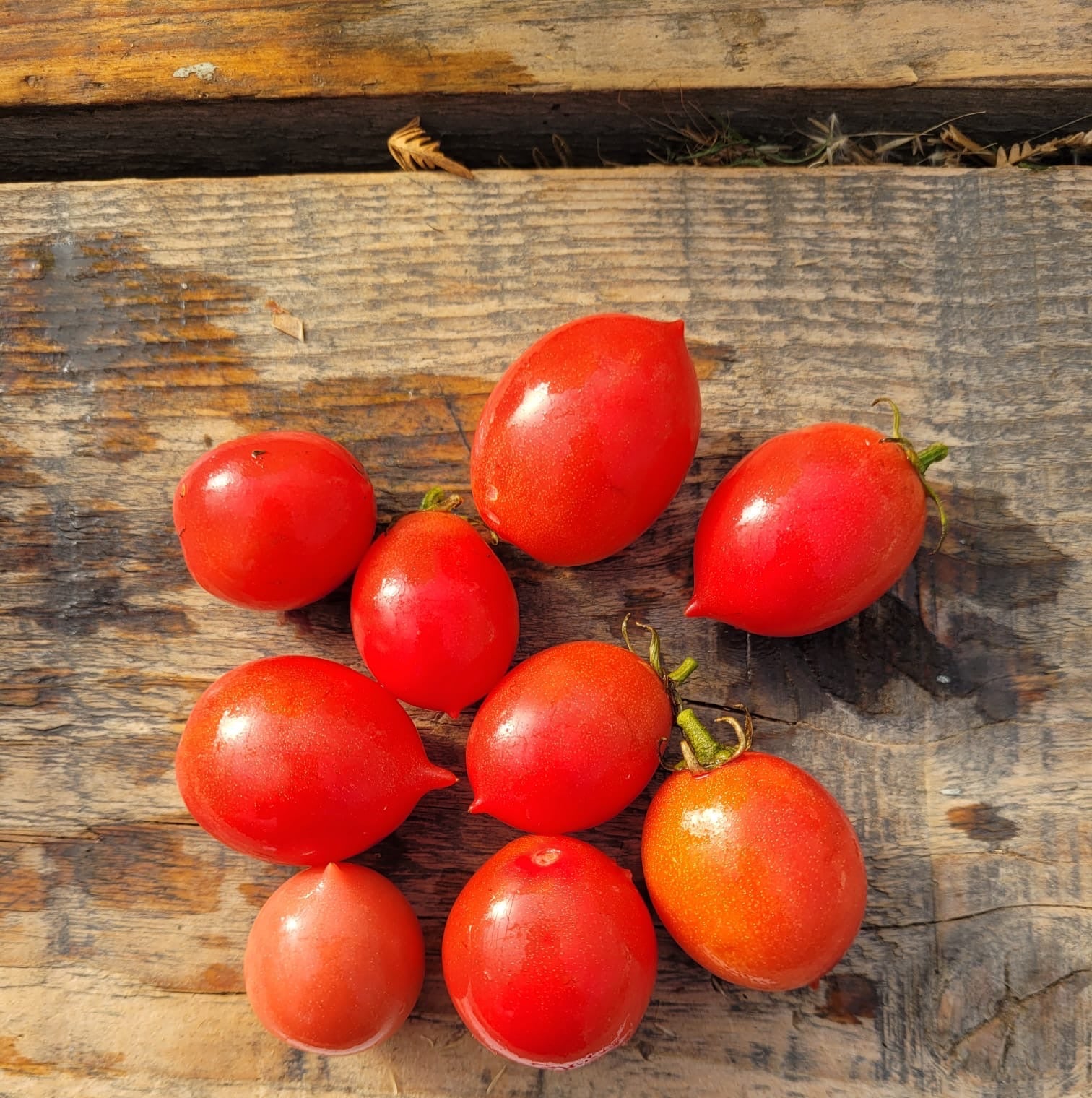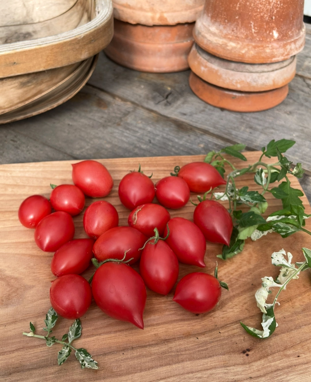 Tomato plant with cascading stems. Large cherry tomatoes that are oval-round, The fruits are pink and weigh around 30grams each.