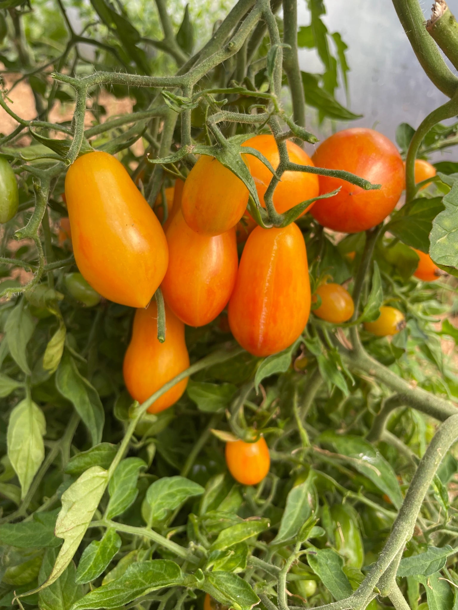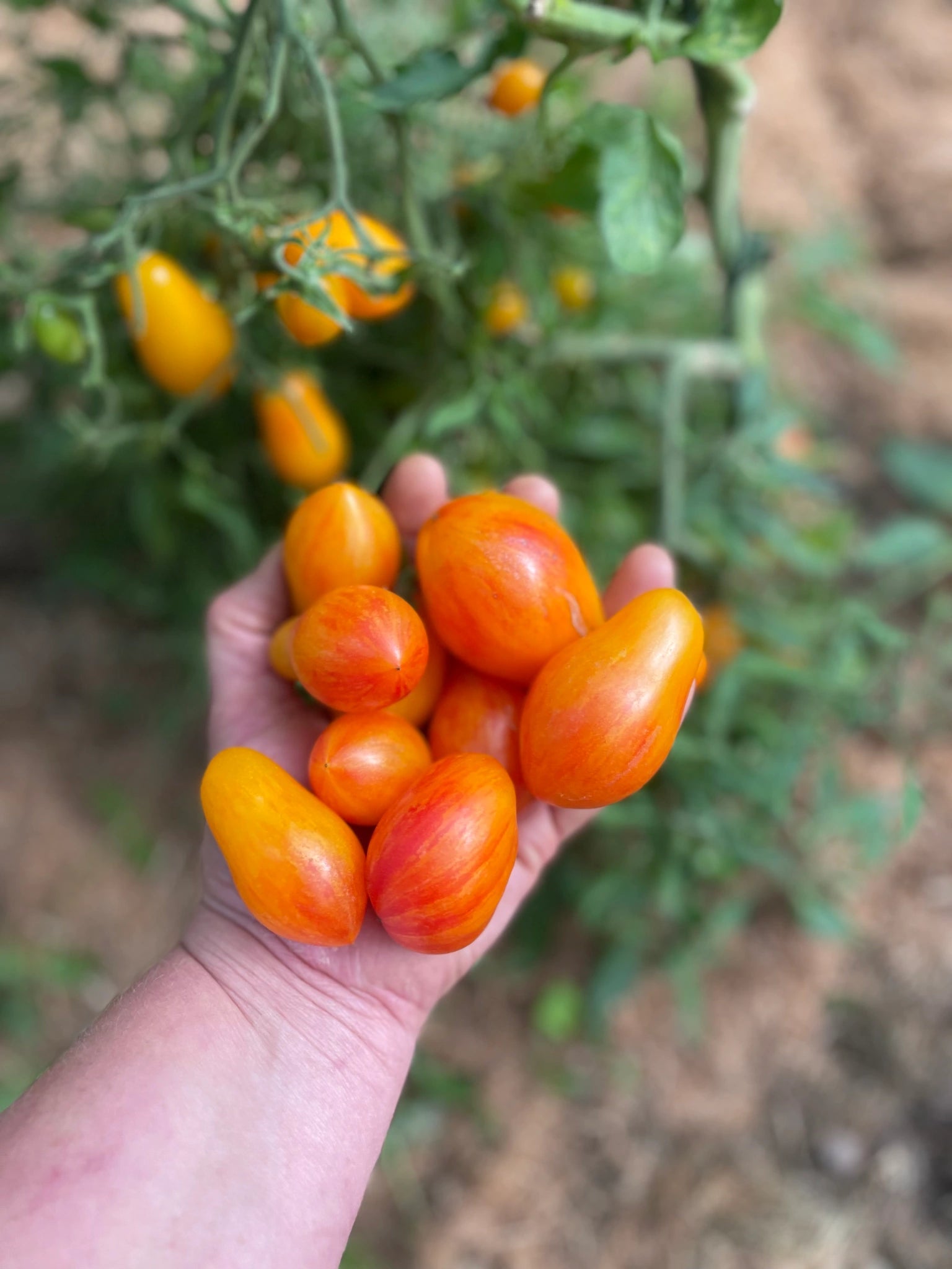 A beautiful pear-shaped cherry tomato with bi colored skin. Orange with yellow stripes. Average fruit weight of about 10 grams. Juicy and sweet bi-colored flesh with a delicious taste. Multiflora type grown as a cordon with very high yields from mid-season