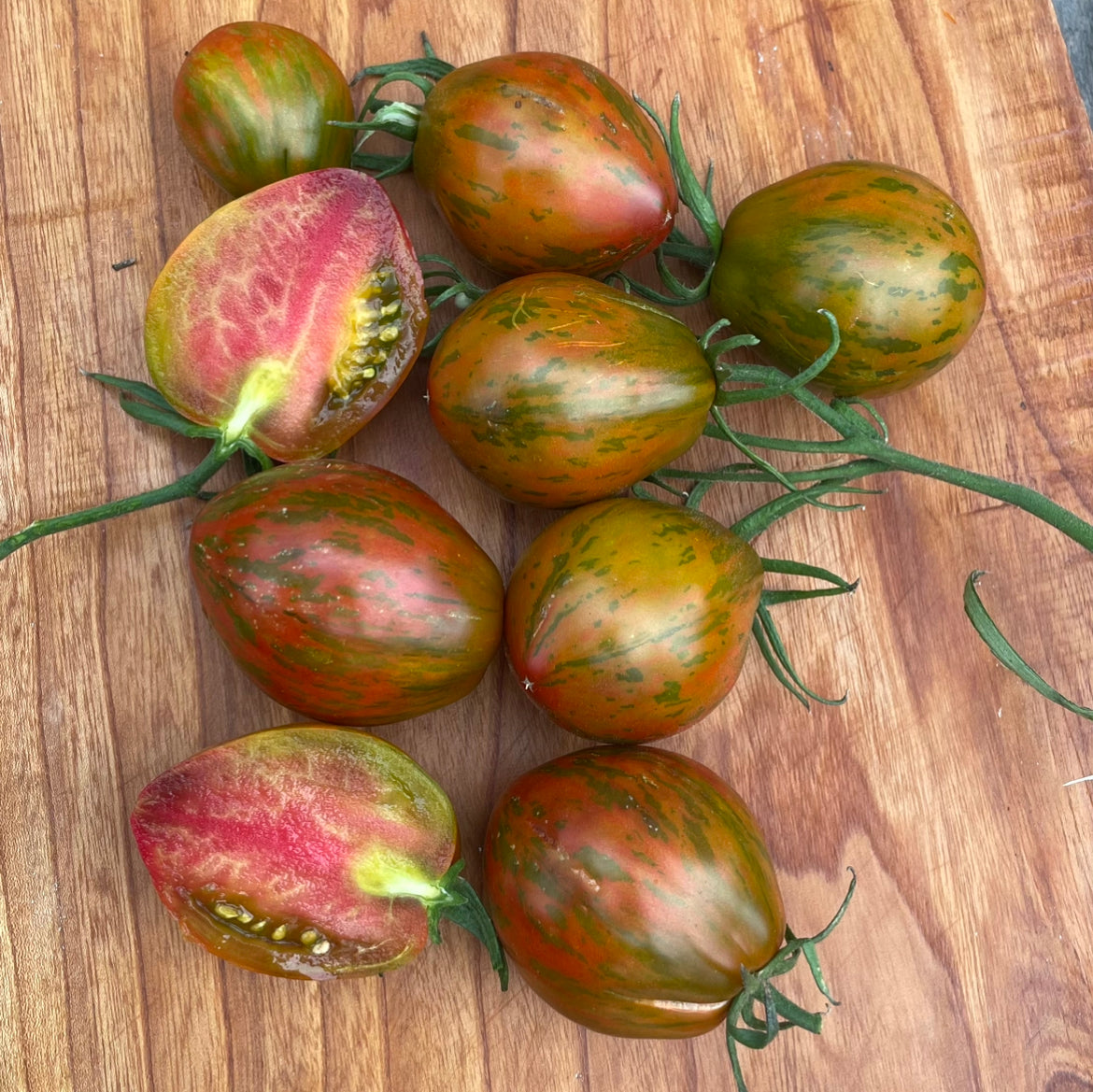 A beautiful bicolored green tomato. This is a mid-season plant with potato leaf foliage. Gorgeous bicolored green pear shaped tomatoes When sliced open they are beautiful with a meaty vibrant green coloring with pink blushes. The taste combines sweetness, acidity, and tartness.