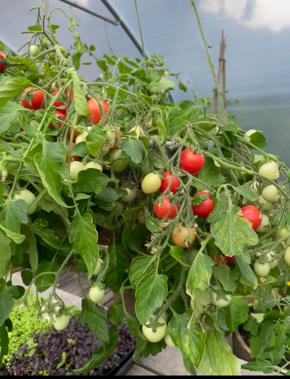 Early bush variety , compact plant with abundant and beautiful tumbling trusses of large cherry tomatoes that seem to ripen in a rainbow from light pearly pink to nearly red. It is quite prolific, and needs a strong support to the hanging basket.