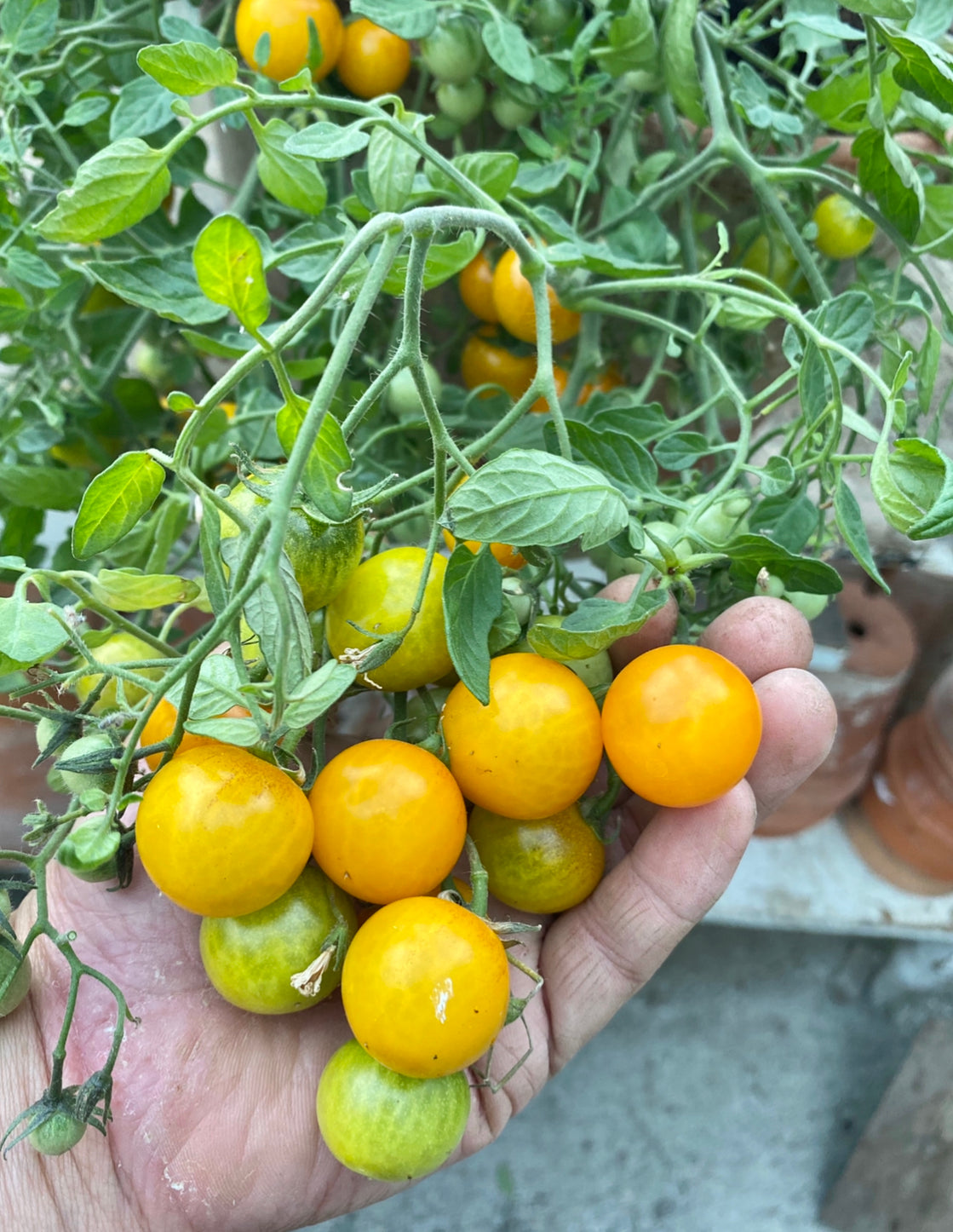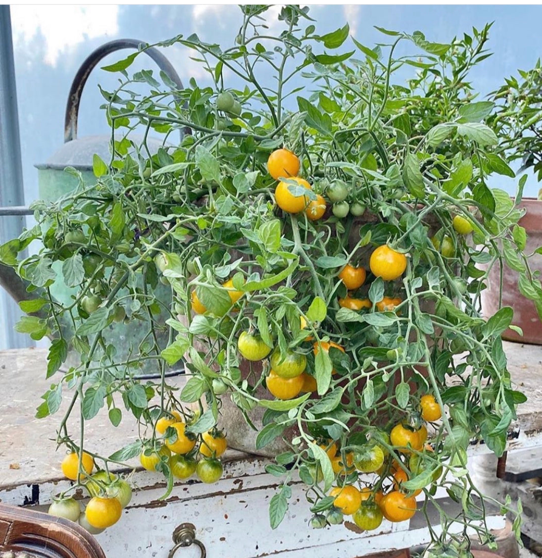 Small bush with beautiful slightly droopy foliage. Perfectly for hanging baskets. Produces masses of yellow orange cherry tomatoes. Wait until the tomatoes are dark yellow before picking them! Then they are incredibly sweet and good, a bit berry-like. A favorite!